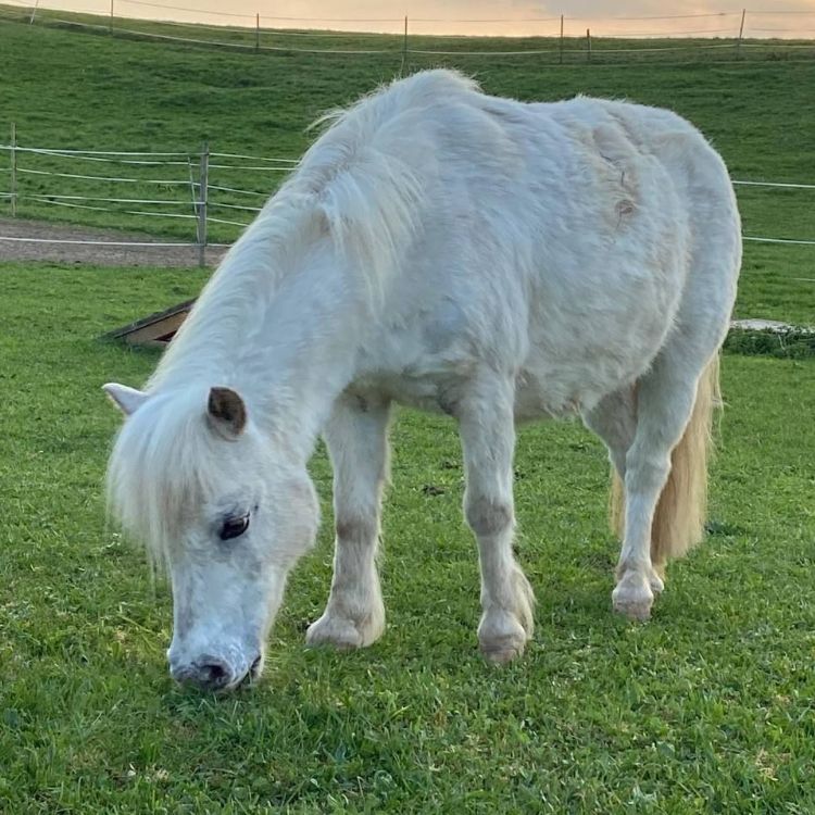 Ich lass alles langsamer mit meinen 12 Jahren angehen, vielleicht bin ich deshalb die Letzte in der Rangfolge. Das macht mir aber nichts aus, sie sind alle meine Freunde. Ich bin ein Welsh-A Schimmel und Kinder sagen, ich sehe wie ein Einhorn aus - nur ohne Horn! Seit 2023 wohne ich auf dem Hof und mein Geburtsdatum ist der 20. Mai 2012